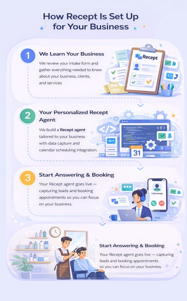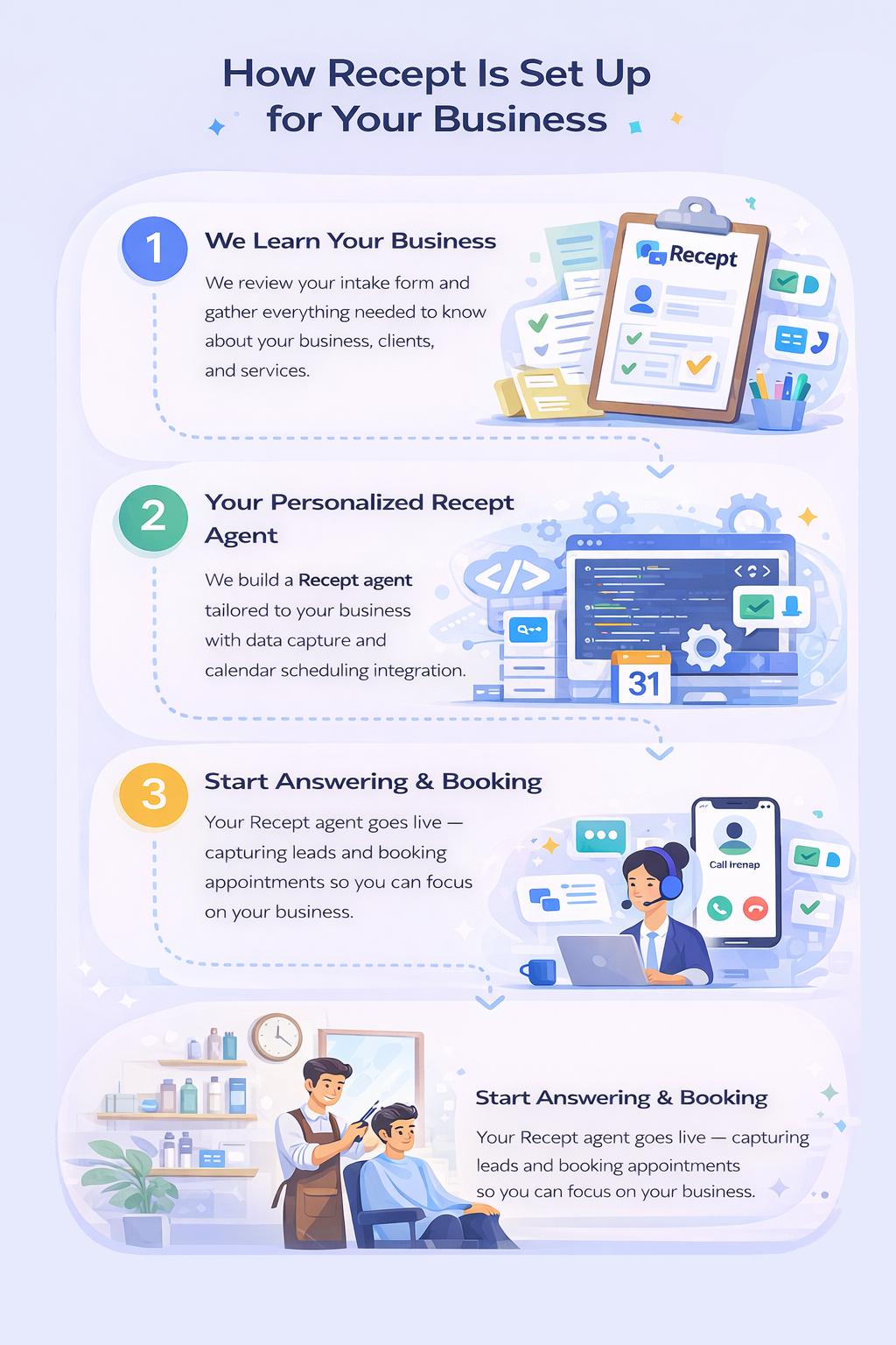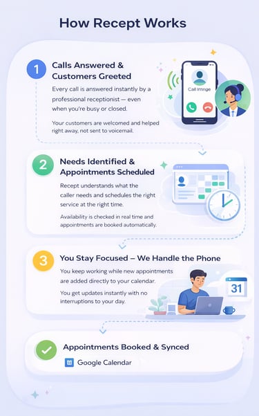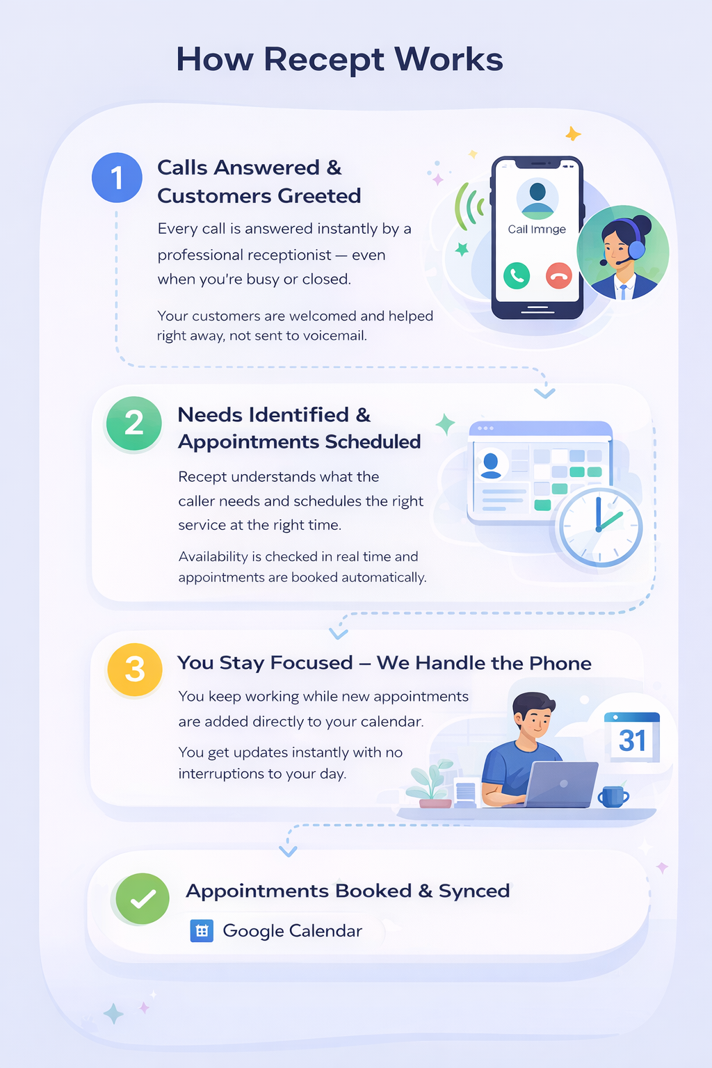 Recept handles your calls, books appointments, and keeps your business running smoothly.